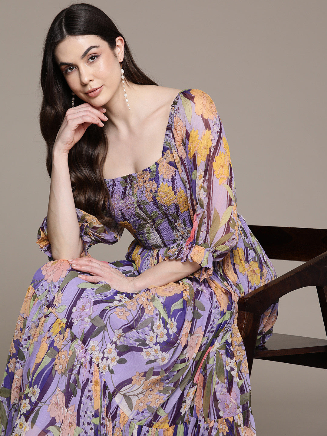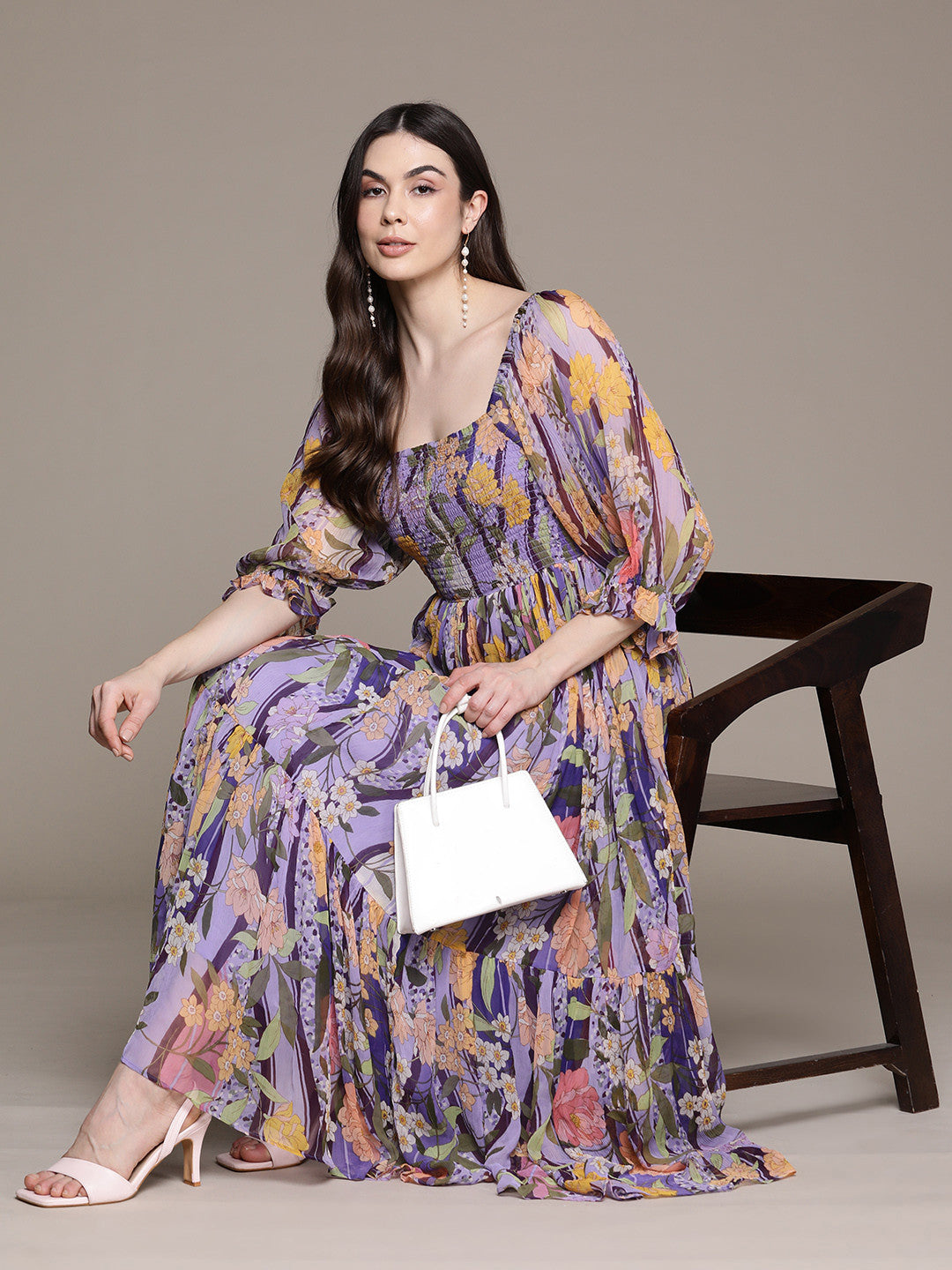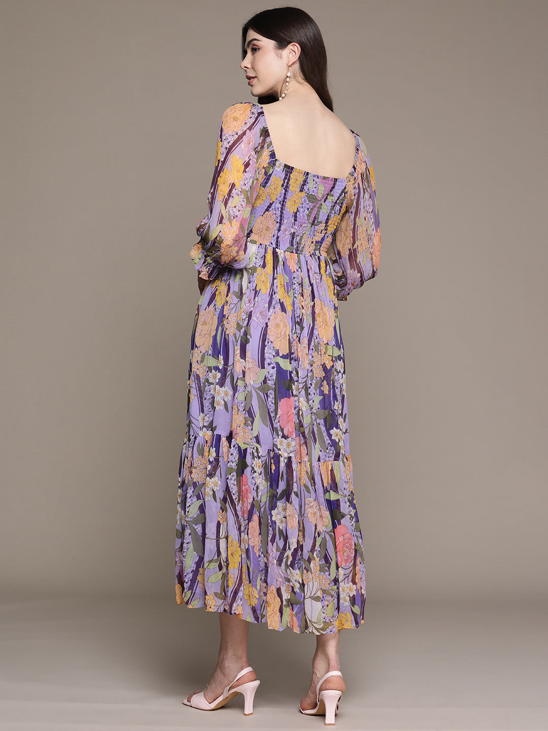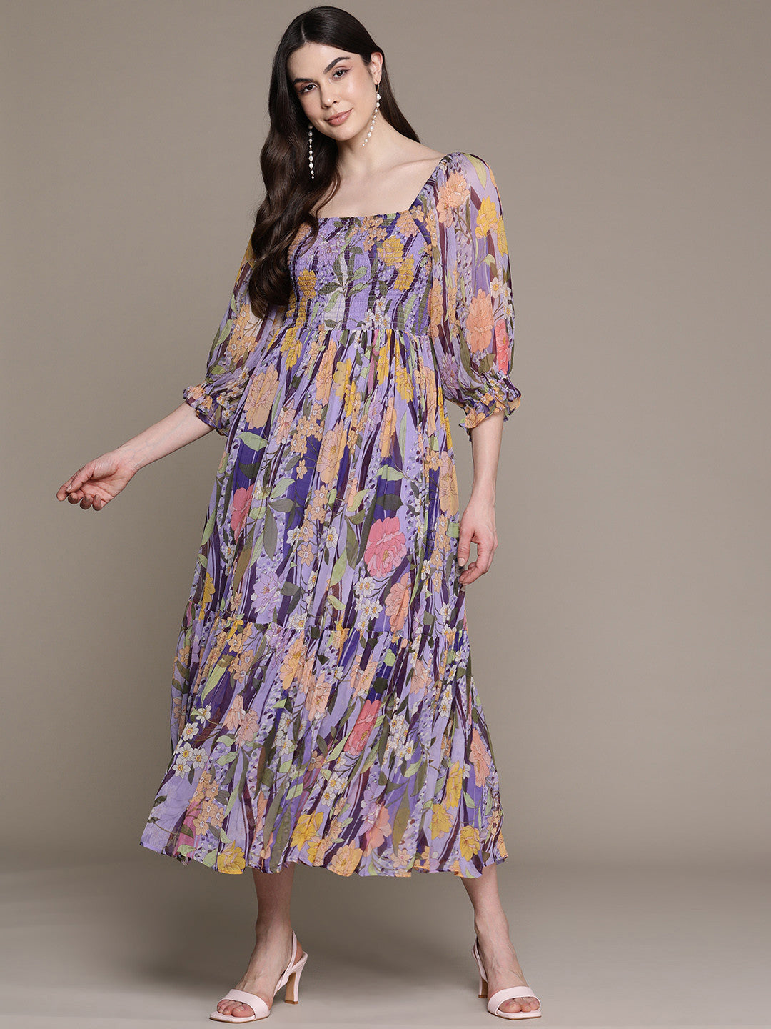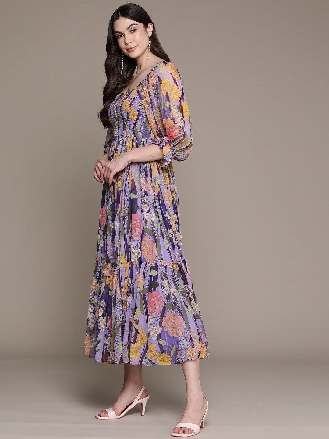 Purple and multicoloured floral print fit & flare dress