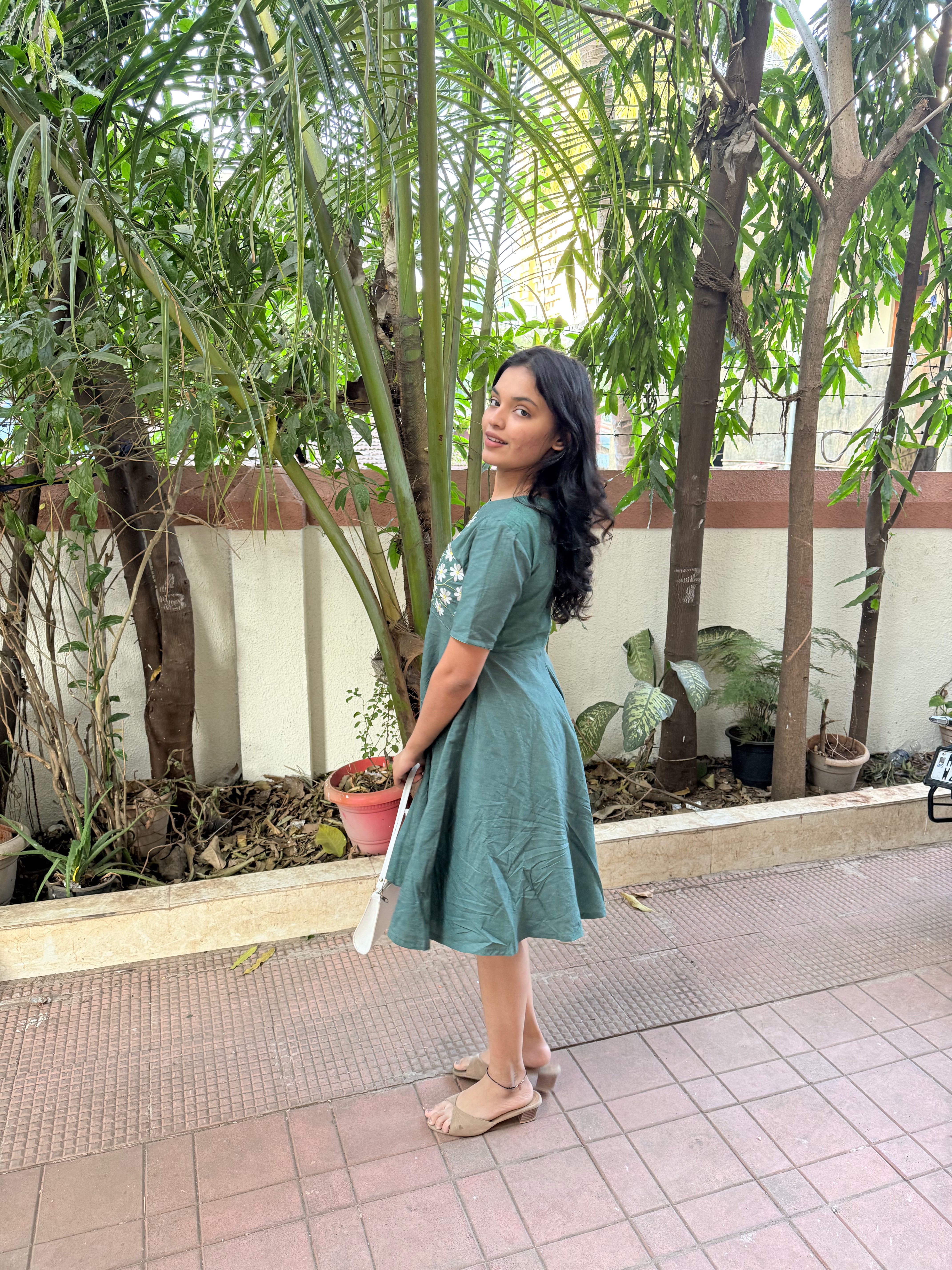 This teal green dress is designed for comfort and effortless charm. Crafted in a breathable fabric, it features a round neckline and short sleeves, complemented by delicate floral embroidery on the front yoke. The fit-and-flare silhouette flows beautifully, offering ease of movement and a flattering drape.