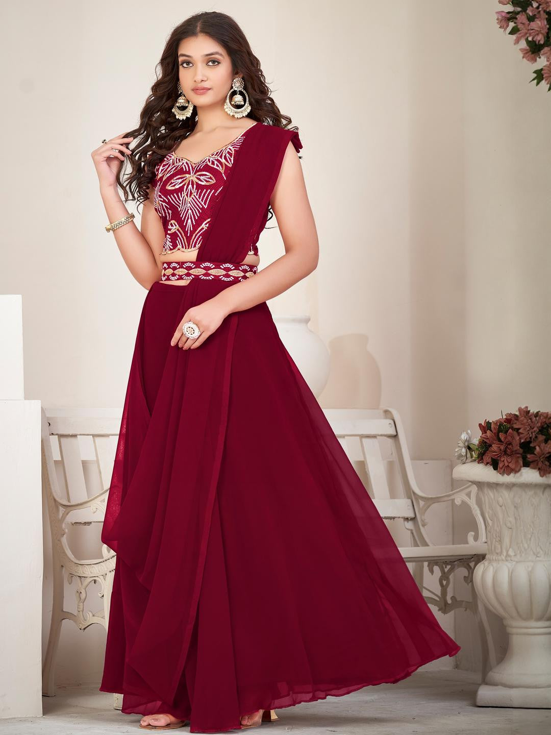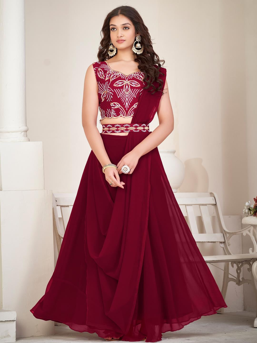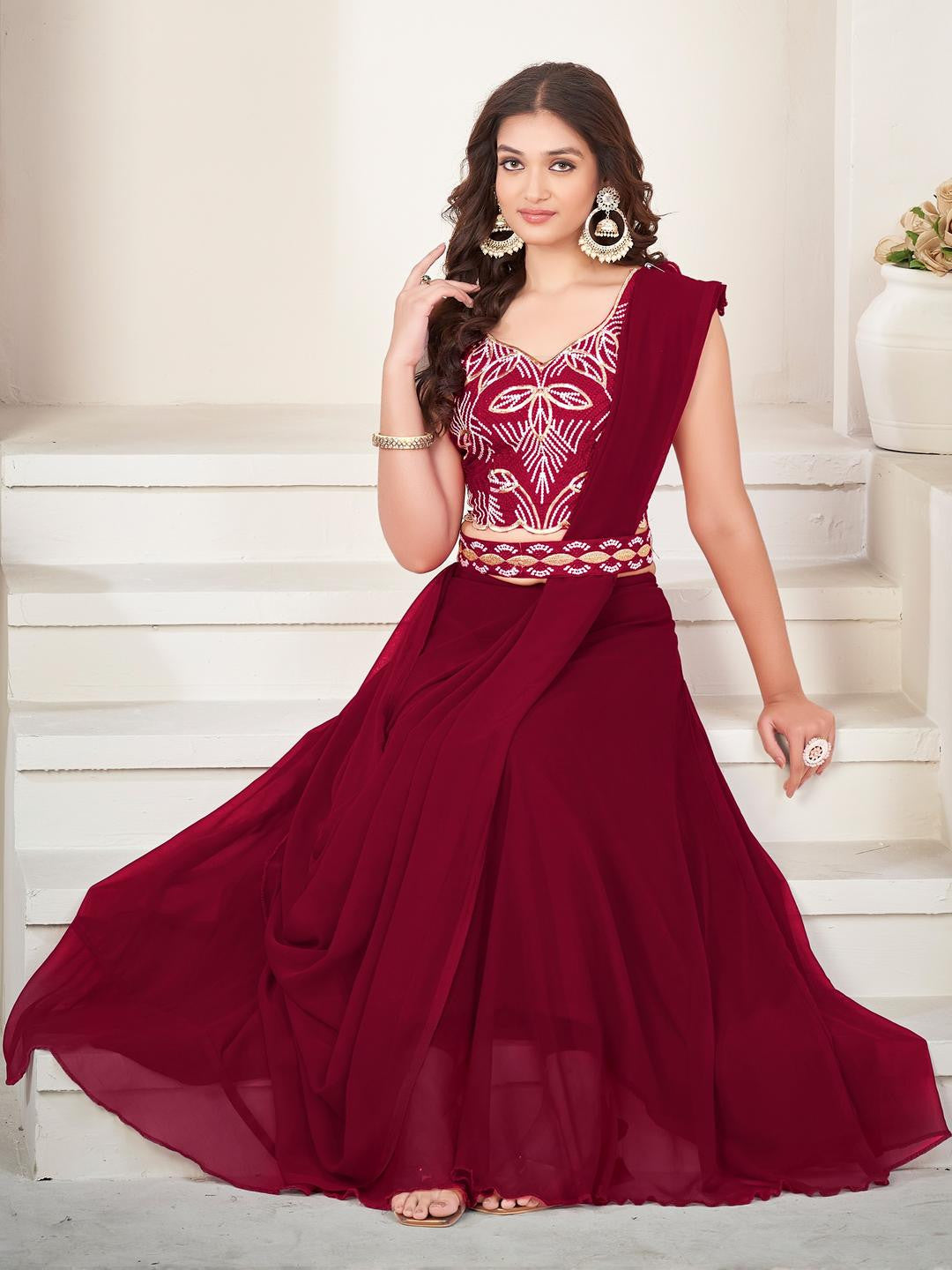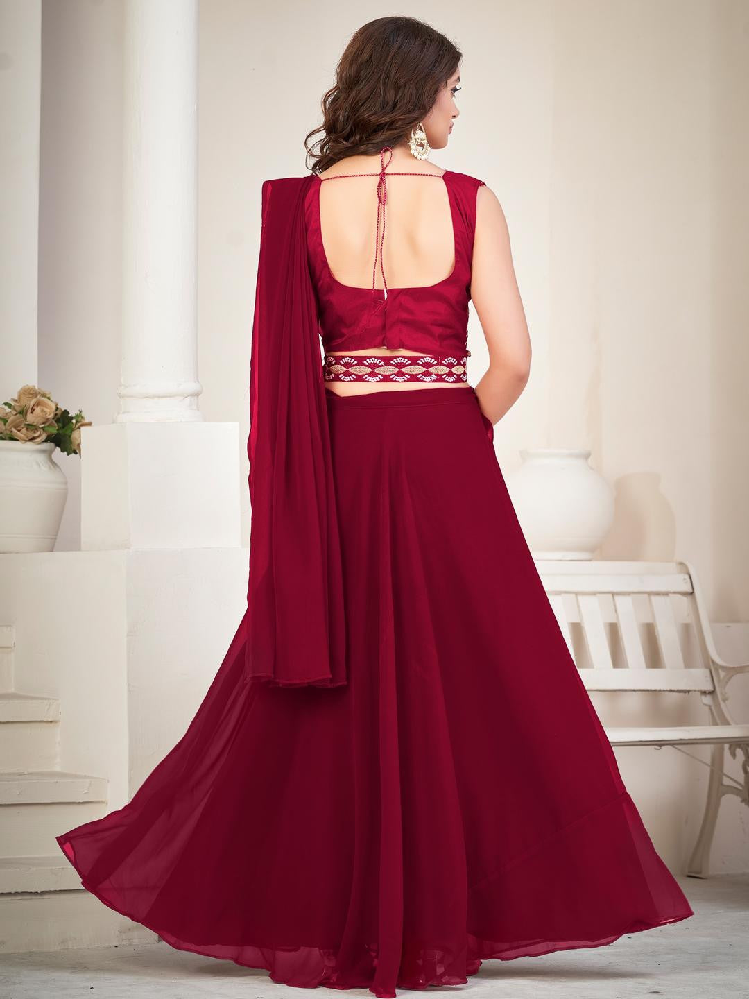 Lehenga Fabric :- Georgette , Lehenga Work :- Plain , Lehenga Inner :- Crepe , Lehenga Flair :- 3mtr , Dupatta Fabric :- Georgette , Dupatta Work :- Plain , Dupatta Size :- 2.2 Mtr , Choli Fabric :- Georgette , Choli Work :- Embroderiy work , Choli Size :- 0.80 Mtr , Belt :- 1Mtr.