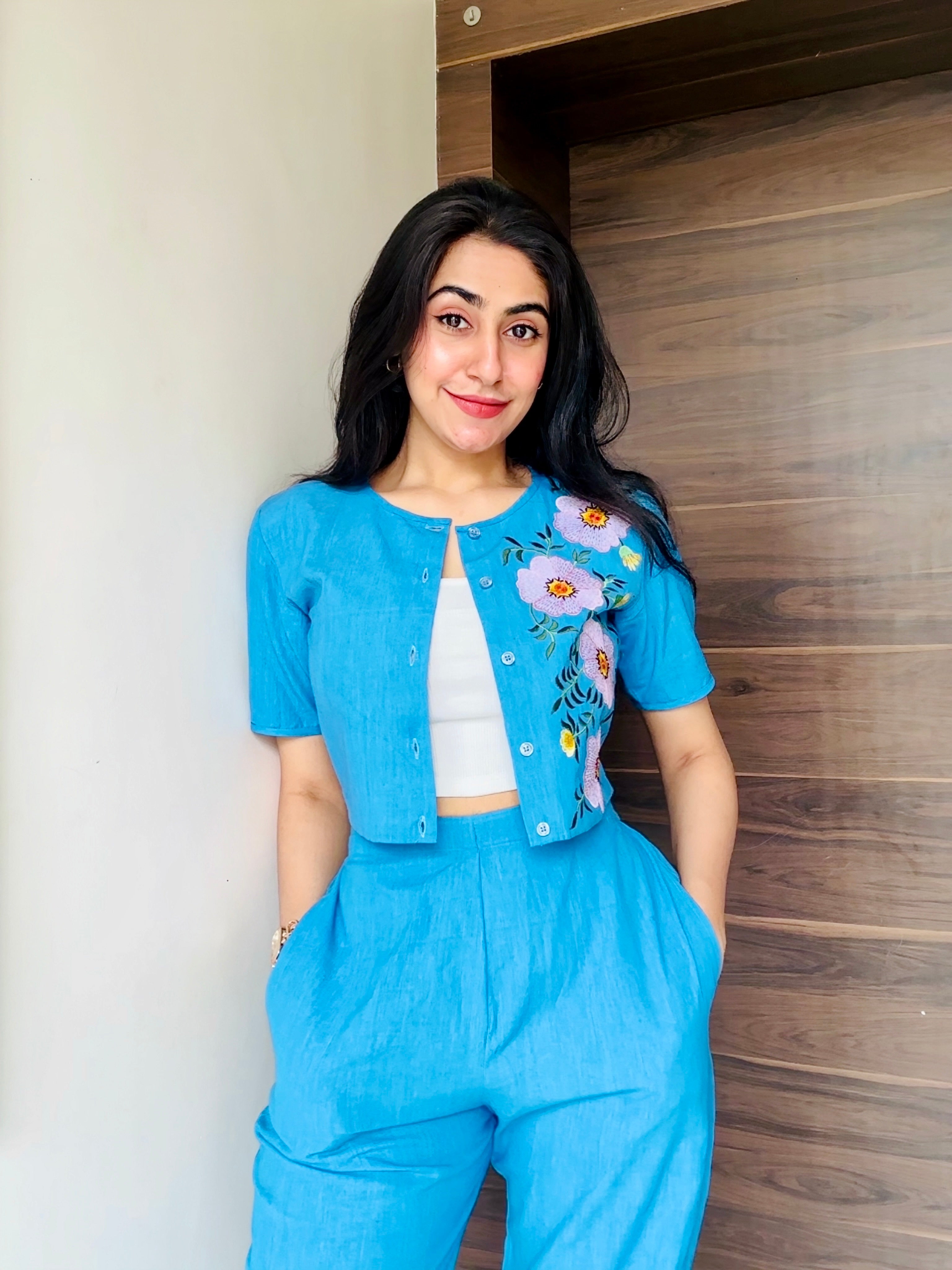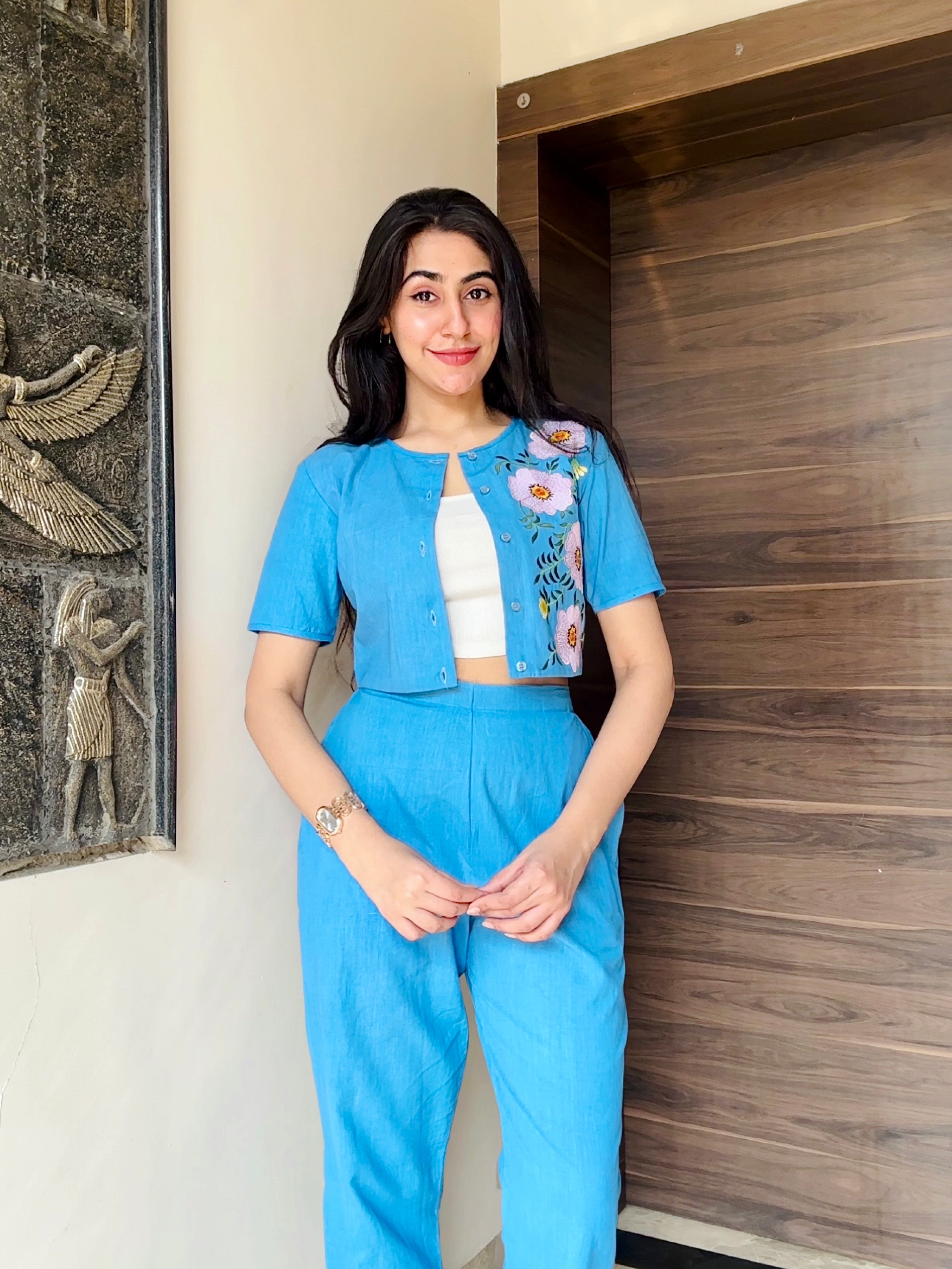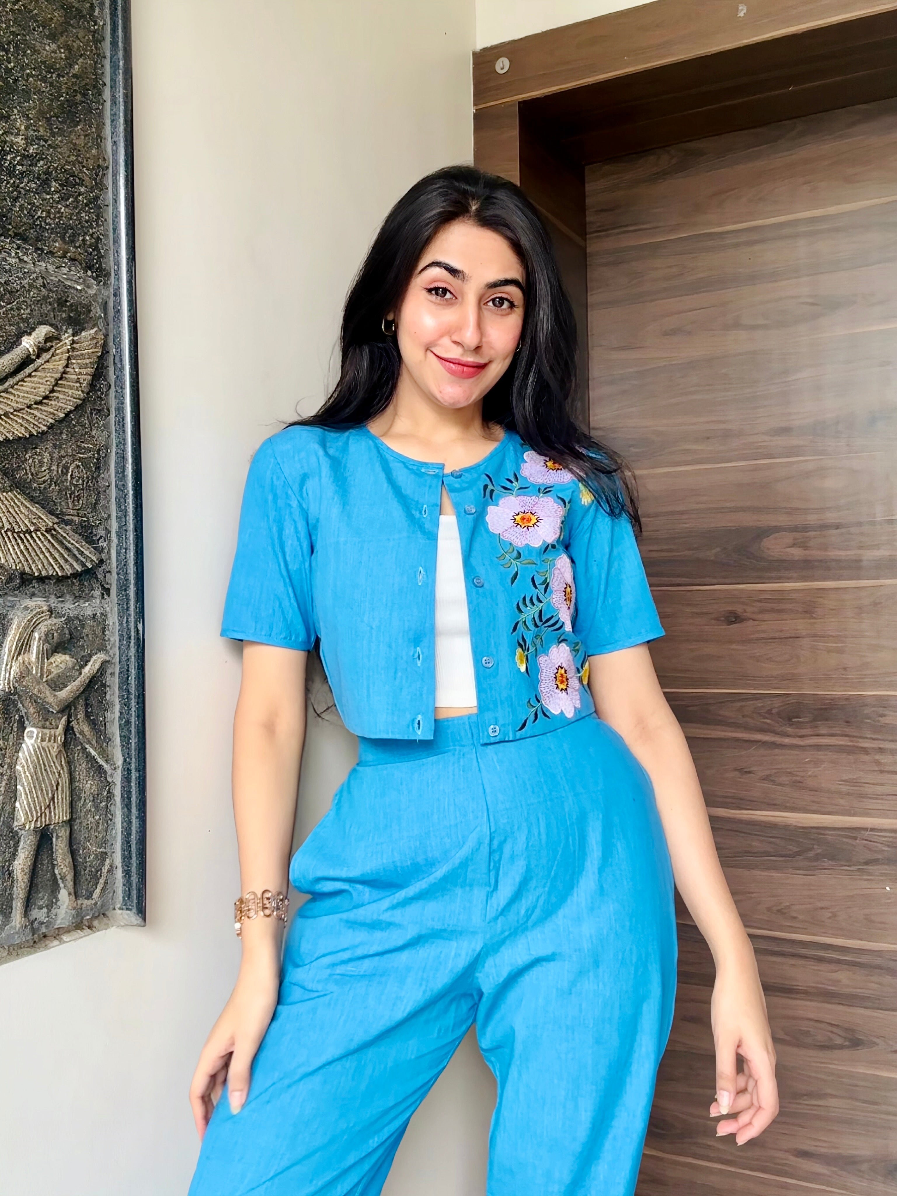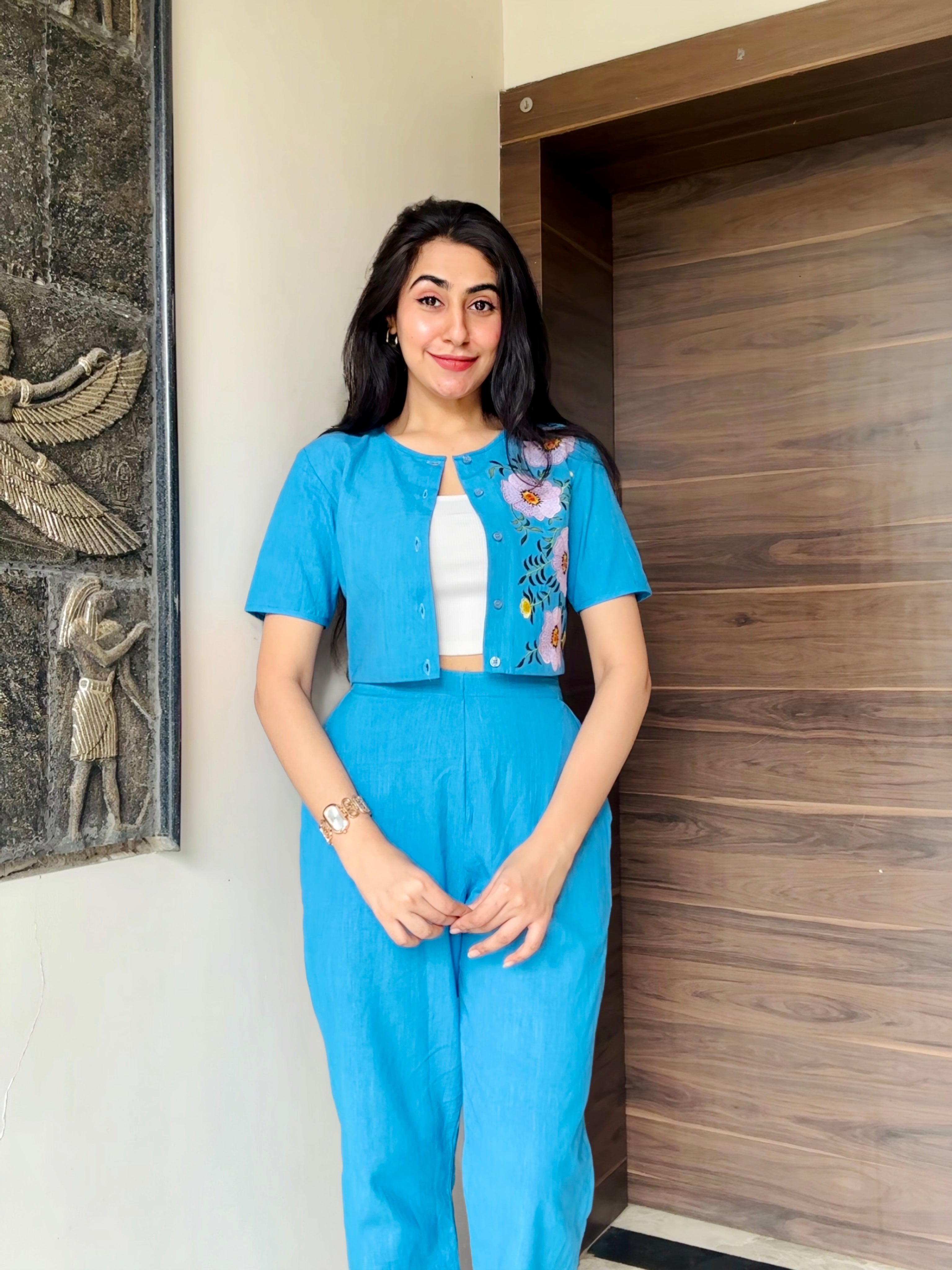 A refreshing sky-blue co-ord set featuring a cropped button-down jacket with floral detailing and relaxed straight-fit pants. A modern yet graceful look for effortless everyday styling.